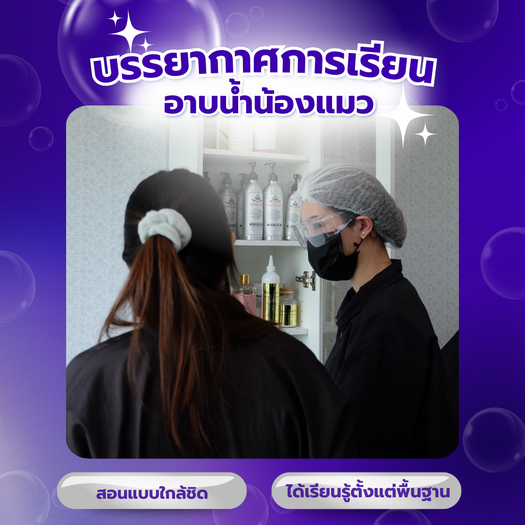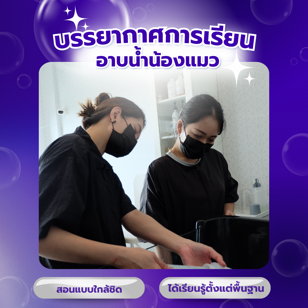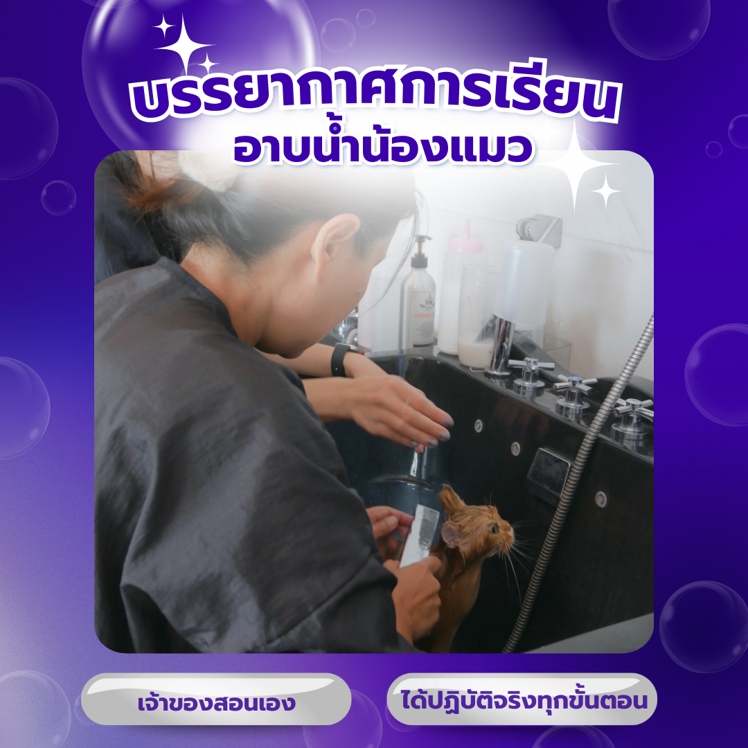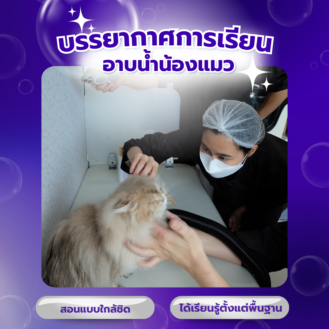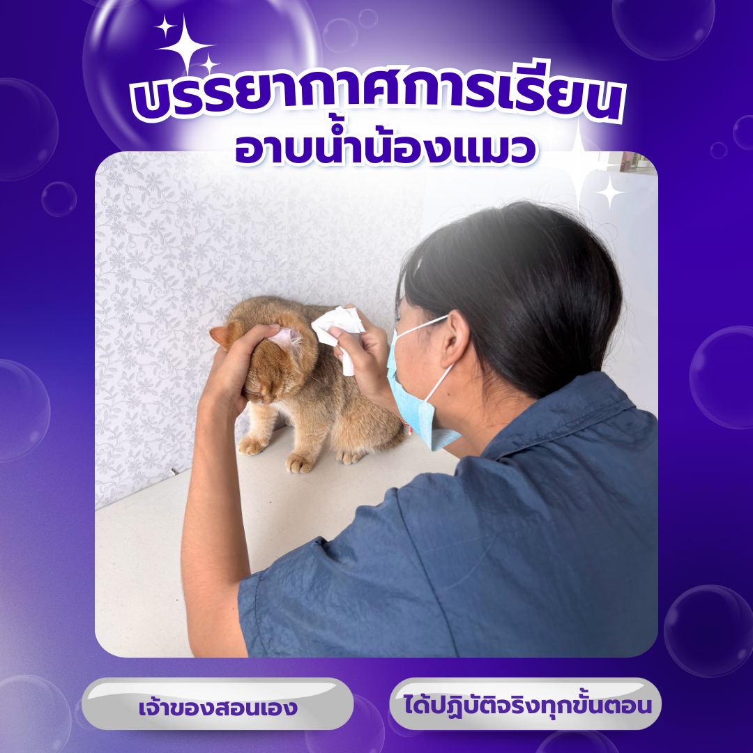 สำหรับคนที่รักแมวและอยากดูแลน้องด้วยตัวเอง แต่กังวลว่าจะทำไม่ถูกวิธี คลาสของเราจะสอนตั้งแต่การจับแมวแบบ Soft Handling, การเตรียมตัวก่อนอาบน้ำ ไปจนถึงการเลือกแชมพูและการเป่าแห้งอย่างปลอดภัย ให้คุณมั่นใจว่าสามารถอาบน้ำแมวได้เองโดยที่น้องไม่เครียด และยังมีสุขภาพขนที่แข็งแรงขึ้น