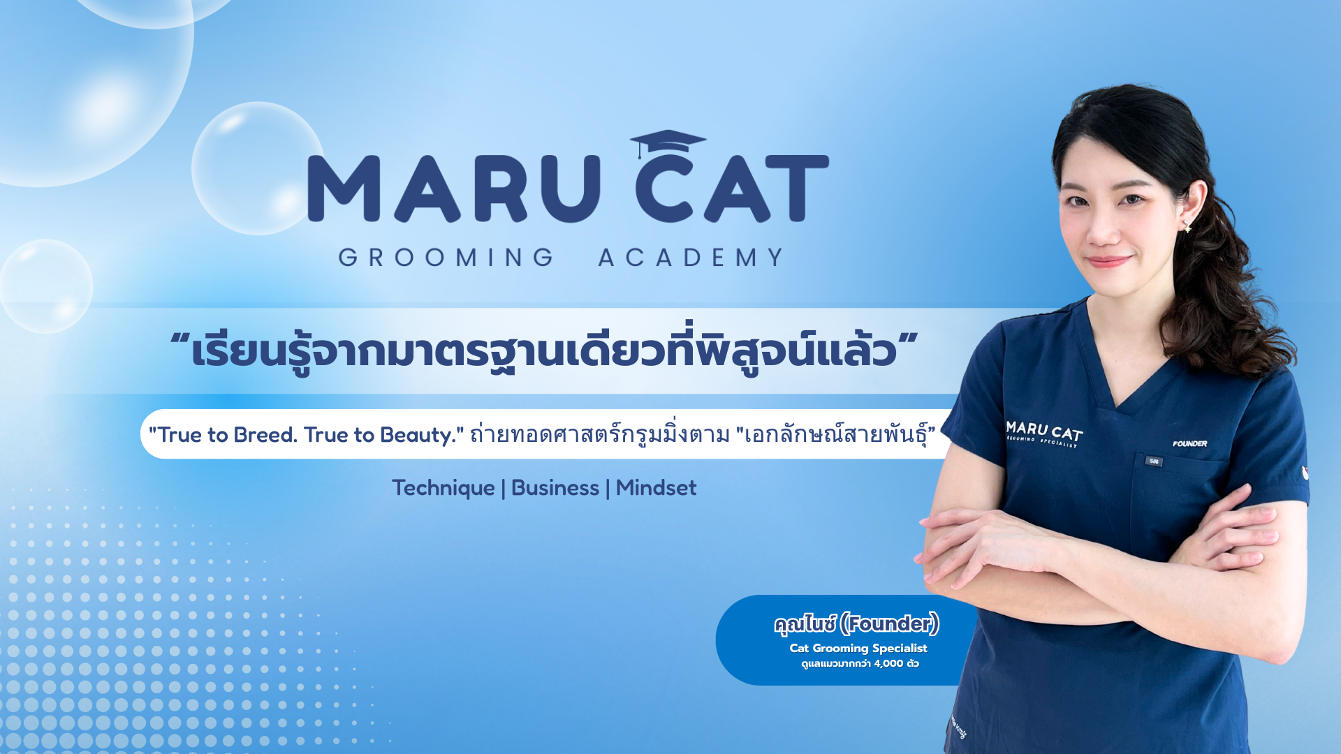 เราถ่ายทอดประสบการณ์ทั้งหมดผ่านมาตรฐาน 4S+ Grooming System™ เพื่อให้คุณมั่นใจว่า ความรู้ที่ได้ สามารถนำไปใช้ "เปิดธุรกิจ" หรือ "ดูแลแมวระดับประกวด" ได้จริง