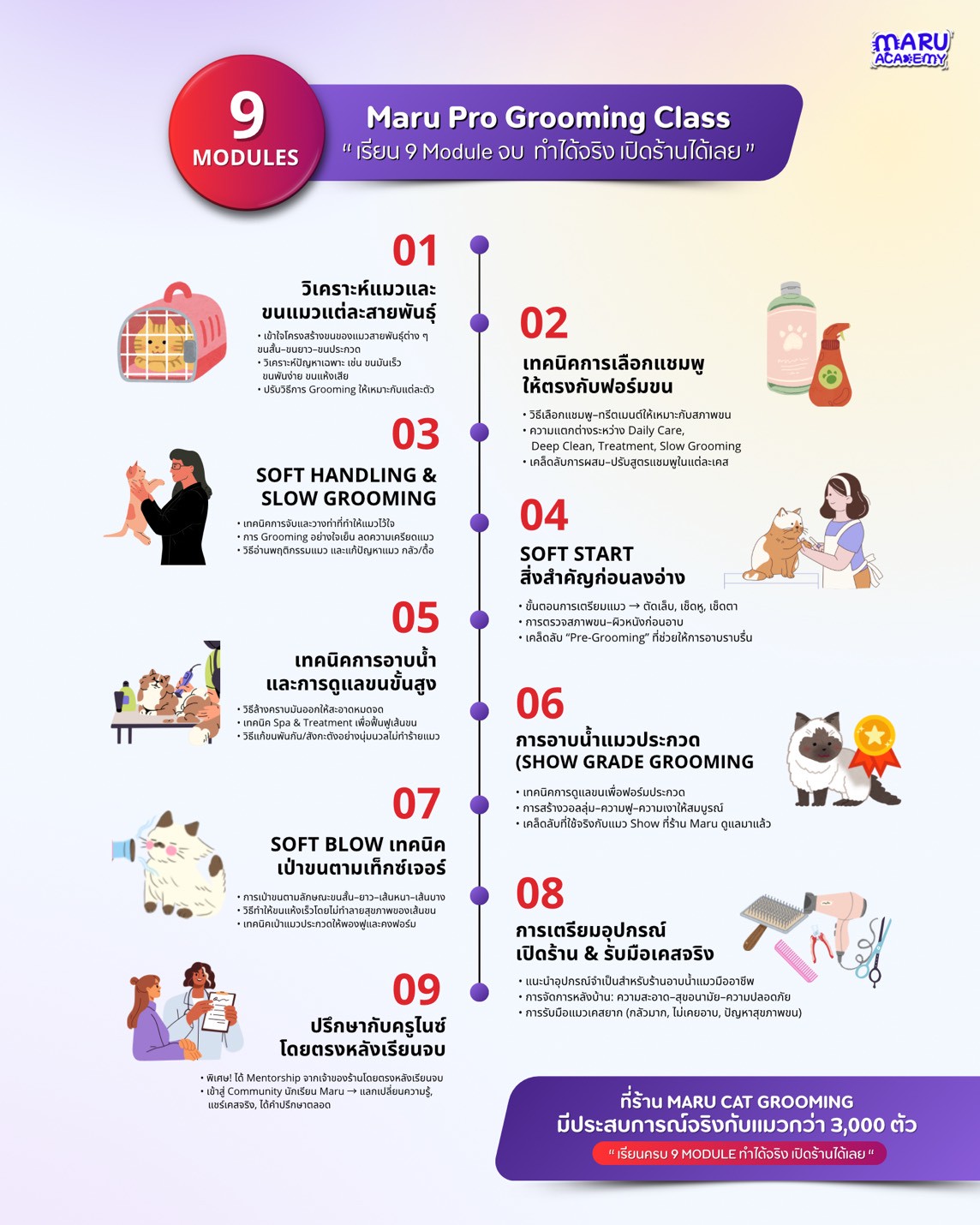 ที่ Maru Cat Academy เราพัฒนาคอร์สเรียนเปิดร้านอาบน้ำแมวจากประสบการณ์ตรงของ Maru Cat Grooming ร้านที่ดูแลแมวมาแล้วกว่า 3,000 ตัว และมีสมาชิกกว่า 300 ครอบครัว เราเข้าใจทั้งมิติของ Grooming และ การบริหารร้าน อย่างแท้จริง