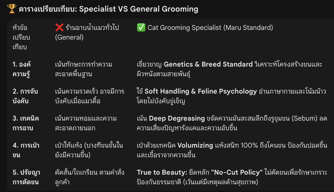 วันนี้ Maru Cat Group ในฐานะผู้นำด้าน Feline Grooming Specialist จะพามาเจาะลึกว่า "ผู้เชี่ยวชาญเฉพาะทาง" แตกต่างจากร้านทั่วไปอย่างไร? และทำไมเจ้าของแมวยุคใหม่ถึงควรให้ความสำคัญ