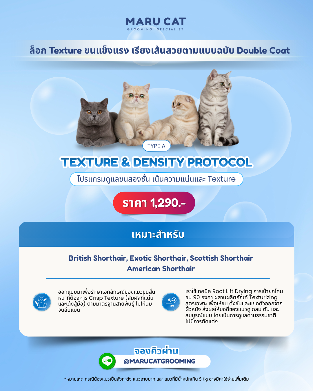 ที่ Maru Cat Group เราดูแลแมวบริติชด้วยโปรแกรม TYPE A : TEXTURE & DENSITY PROTOCOL ซึ่งออกแบบมาเพื่อล็อกสัมผัสขนให้แน่นโดยเฉพาะ ด้วย 3 ขั้นตอนสำคัญ: