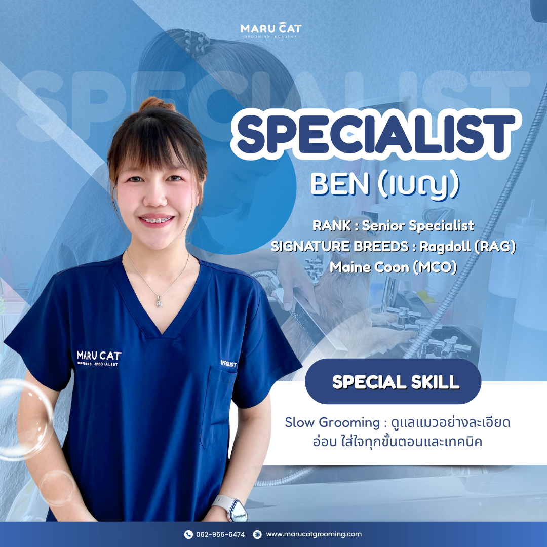ทีมช่างของเราทั้ง 5 ท่านไม่ใช่ช่างกรูมมิ่งทั่วไป แต่คือ Specialist ที่ถูกเคี่ยวกรำจาก Maru Cat Academy โดยเฉพาะ ทุกคนมีความรู้ลึกในเรื่อง Breed Standards และพฤติกรรมศาสตร์แมว ผ่านการทดสอบความเชี่ยวชาญในการรับมือแมวทุกสายพันธุ์ เพื่อมอบการดูแลที่ละเมียดละไมที่สุดในทุกขั้นตอน ด้วยประสบการณ์ดูแลน้องแมวของมารุรวมกว่า 5,000 ตัว ตลอดที่ผ่านมา ในการดูแลน้องแมวหลากหลายสายพันธุ์ พร้อมปรับจังหวะการดูแลตามนิสัยของแต่ละตัว ให้น้องแมวสบายใจและรู้สึกผ่อนคลายที่สุดตลอดการอาบน้ำ